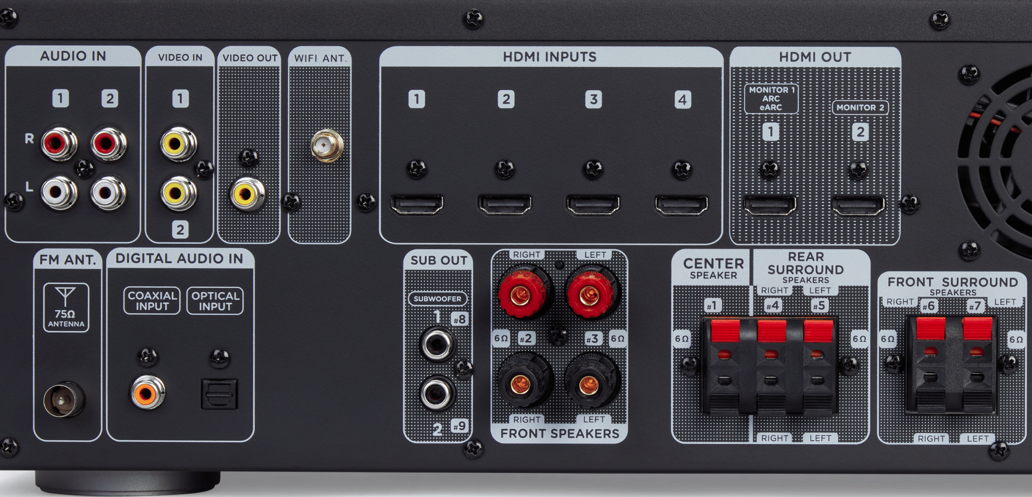 - Salidas: 2x HDMI eARC, video compuesto, 2x salida previa subwoofer, auriculares 6,5 mm