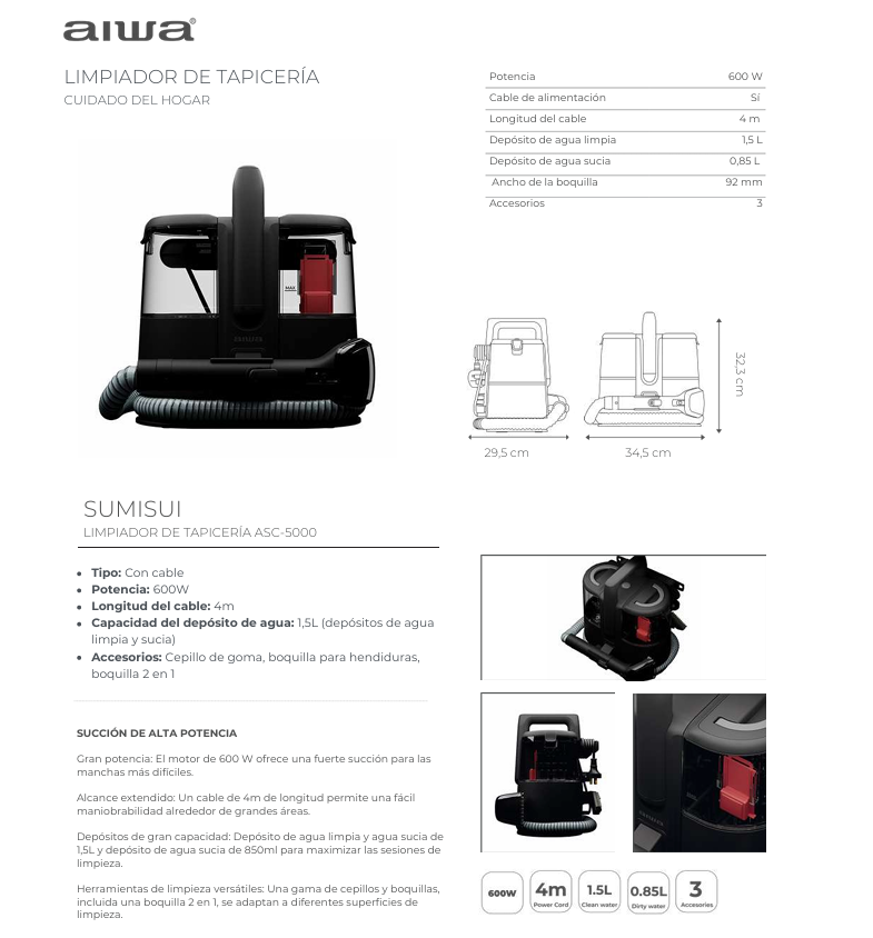 Cuando las manchas se resisten y los olores se incrustan en los tejidos, hace falta algo más que una pasada rápida. Aiwa SUMISUI ASC-500 es un limpiador de tapicerías compacto y potente diseñado para higienizar en profundidad sofá, colchón, alfombras, sillas, asientos del coche y todo tipo de textiles del hogar. Su motor de 600 W, el sistema de doble depósito y un set de boquillas especializadas forman un equipo ideal para despegar suciedad, aspirarla y dejar las superficies visiblemente limpias y frescas. Su diseño con cable de 4 m ofrece alcance continuo y estable para sesiones de limpieza prolongadas sin interrupciones.