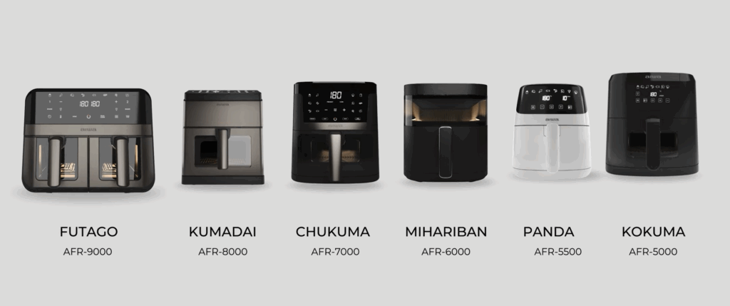 La Serie AirFryer de Aiwa se posiciona como la gama más completa del mercado: desde la Futago 9000, con doble cesta y potencia profesional, hasta la Kokuma 5000, enfocada en la eficiencia energética y el silencio de operación. Cada modelo incorpora pre-sets inteligentes, ventanas de supervisión y un diseño minimalista que enriquece cualquier cocina.