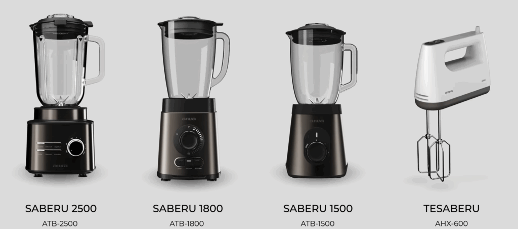 La Serie Saberu de Aiwa ofrece soluciones de alto rendimiento para cada necesidad: desde la versatilidad diaria del Saberu 1500 hasta la potencia semiprofesional del Saberu 2500, sin olvidar la precisión de Tesaberu para repostería.