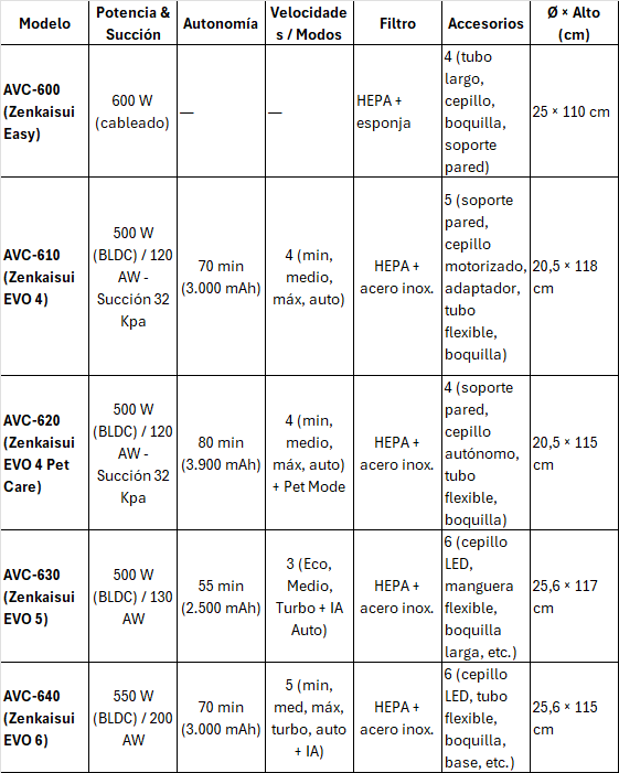 - Cuerpos ligeros (1,4 kg en EVO 5) o ruedas suaves y asas cómodas para modelos cableados.